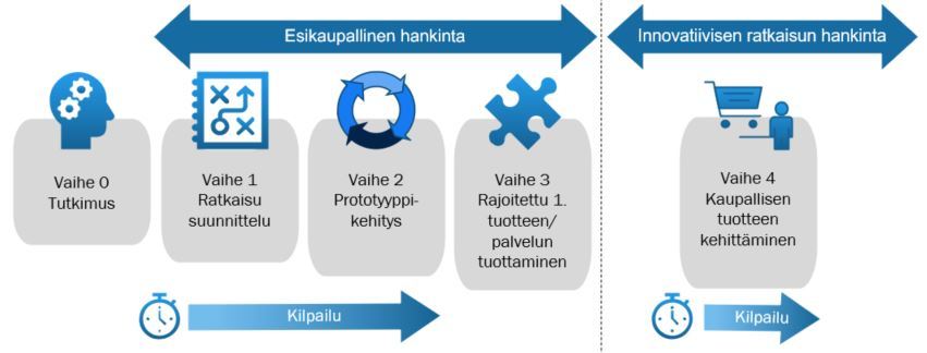 - Esikaupallista hankintaa (PCP, Pre commercial procurement) voidaan käyttää tilanteissa, jolloin ei ole nähtävissä lähellä kaupallista ratkaisua olevaa tuotetta tai ratkaisuun tarvitaan lisää tutkimus tai tuotekehityspanostuksia. Esikaupallisessa hankinnassa voidaan analysoida eri vaihtoehtoja, niiden riskejä ja toteuttamiskelpoisuutta. Hankintayksikön näkökulmasta keskeistä on tarpeen määrittely ja siihen liittyvän kehitystyön tunnistaminen. Onnistumisen keskiössä on innovaatiodialogi